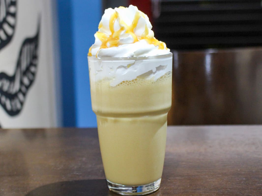 Espresso, leite, syrup de caramelo, frappease de baunilha, chantilly e calda de caramelo. 350 ml