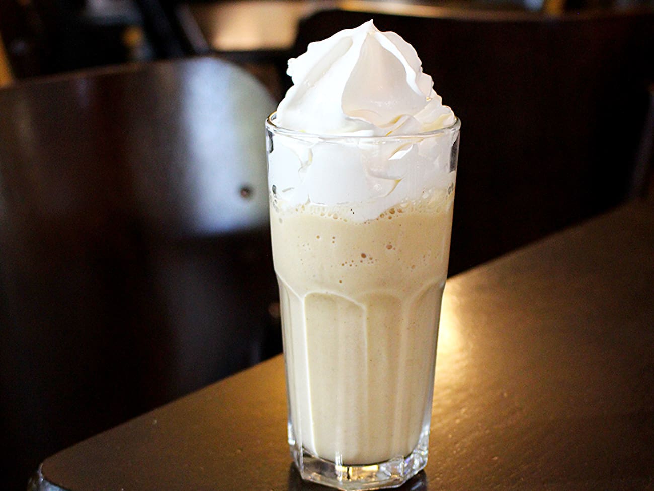 Leite, chai latte, frappease de baunilha e chantilly.